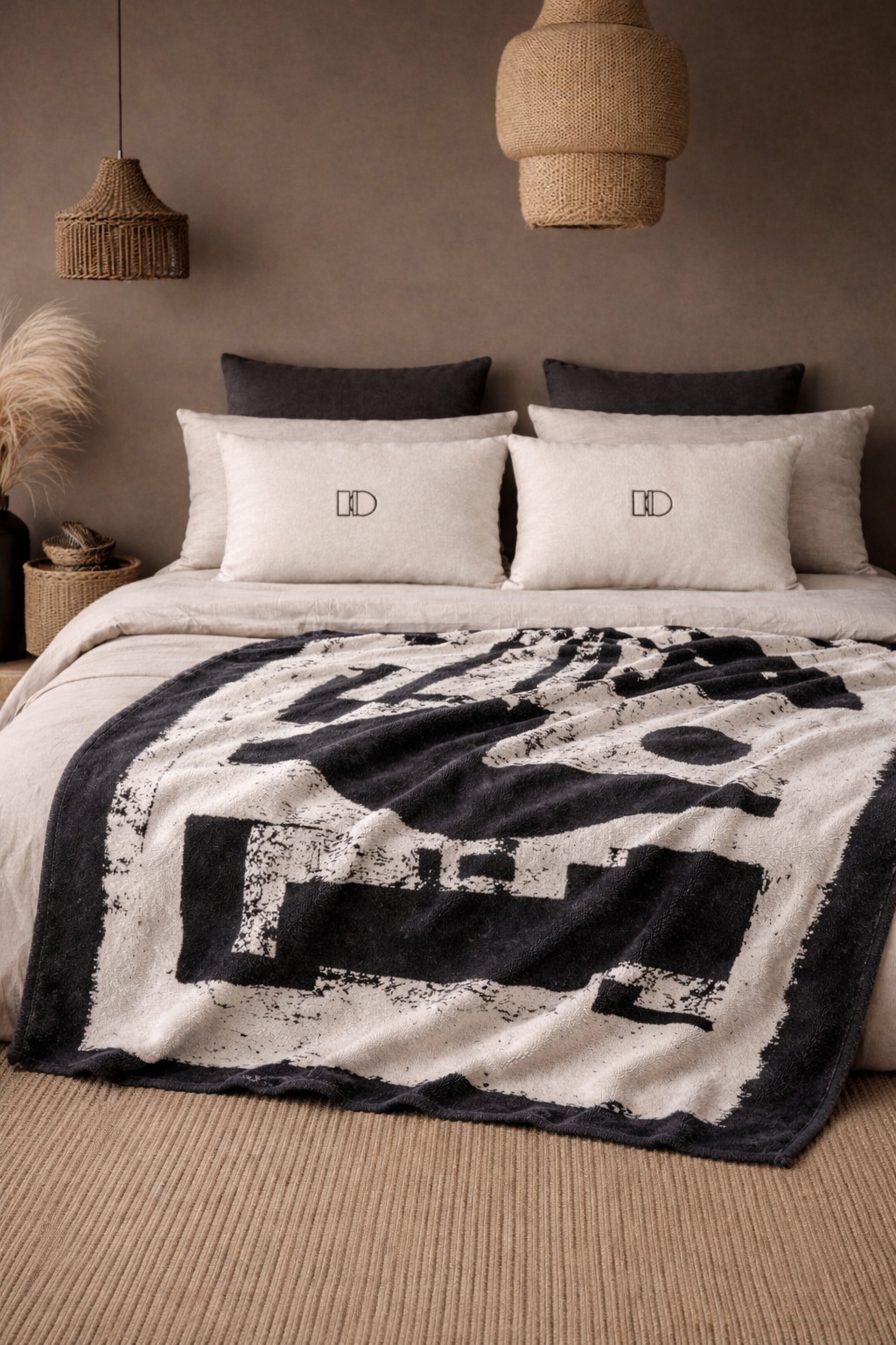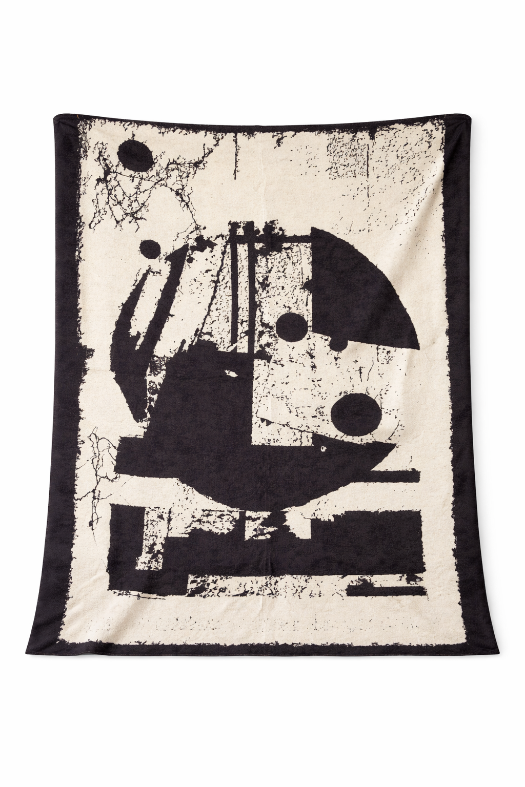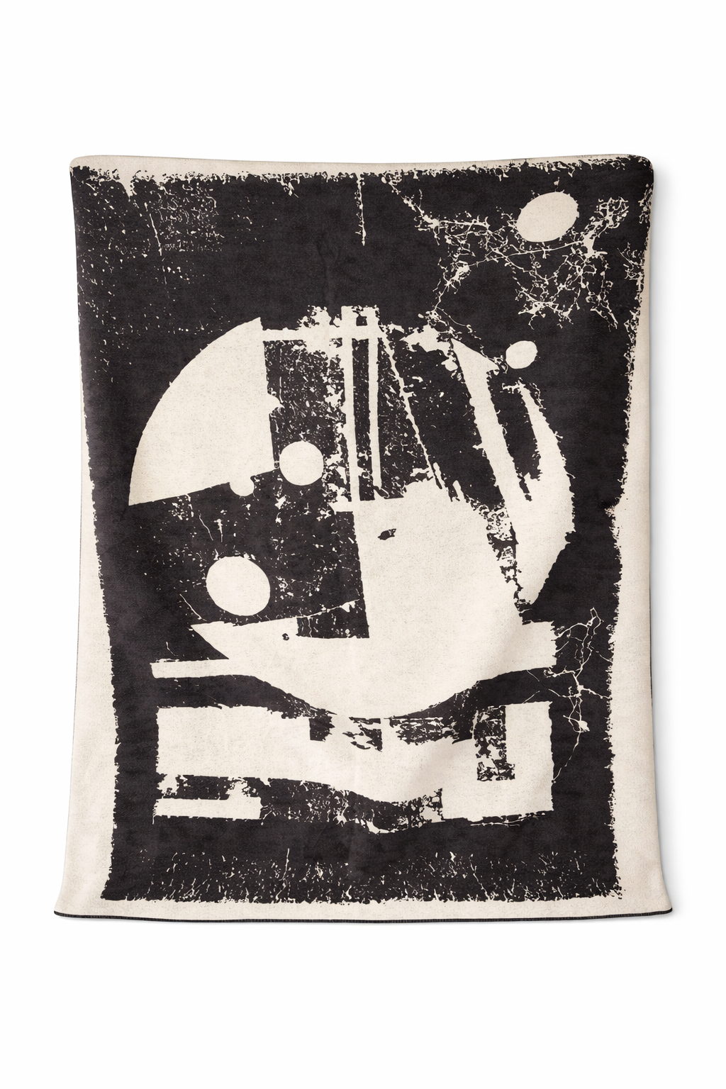 Dwustronny koc z wyrazistym abstrakcyjnym wzorem, utrzymany w kontrastowych barwach z minimalistycznym logo.