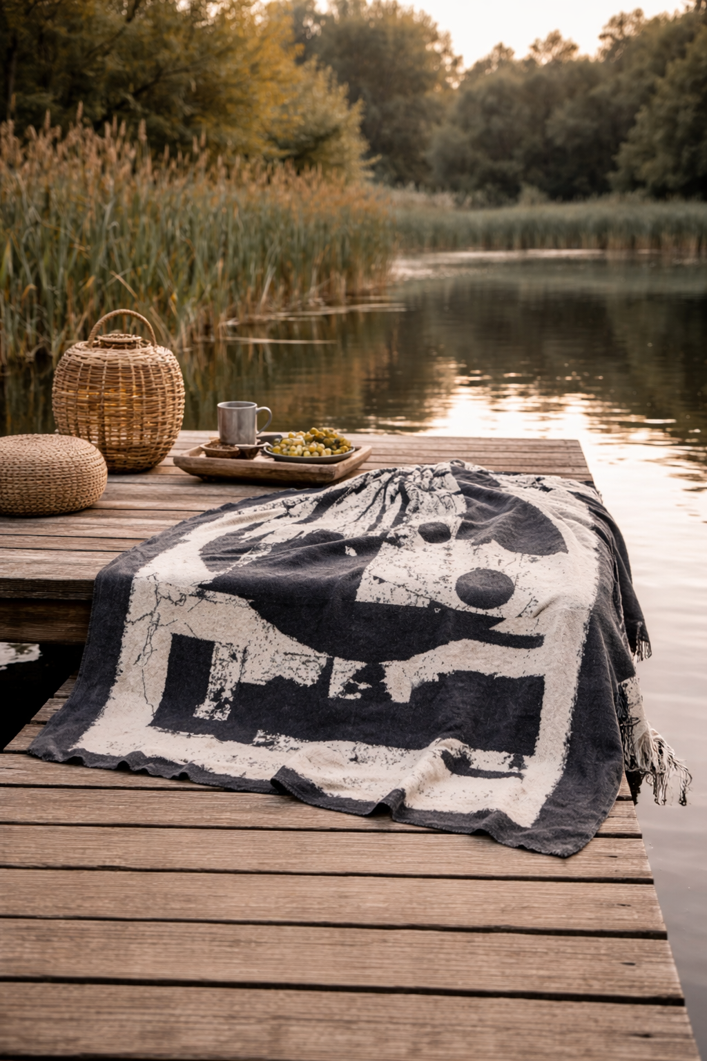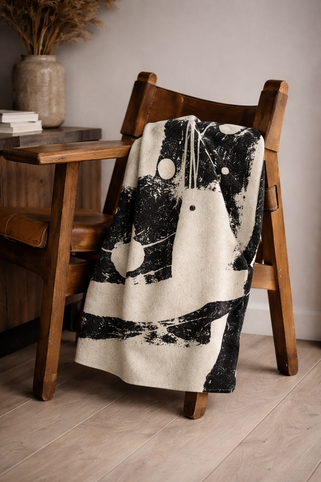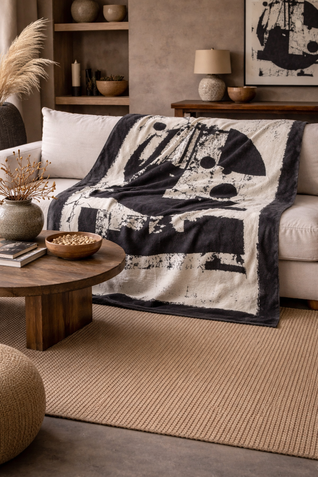 Dwustronny koc z wyrazistym abstrakcyjnym wzorem, utrzymany w kontrastowych barwach z minimalistycznym logo.