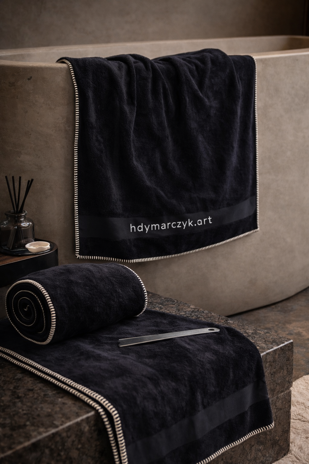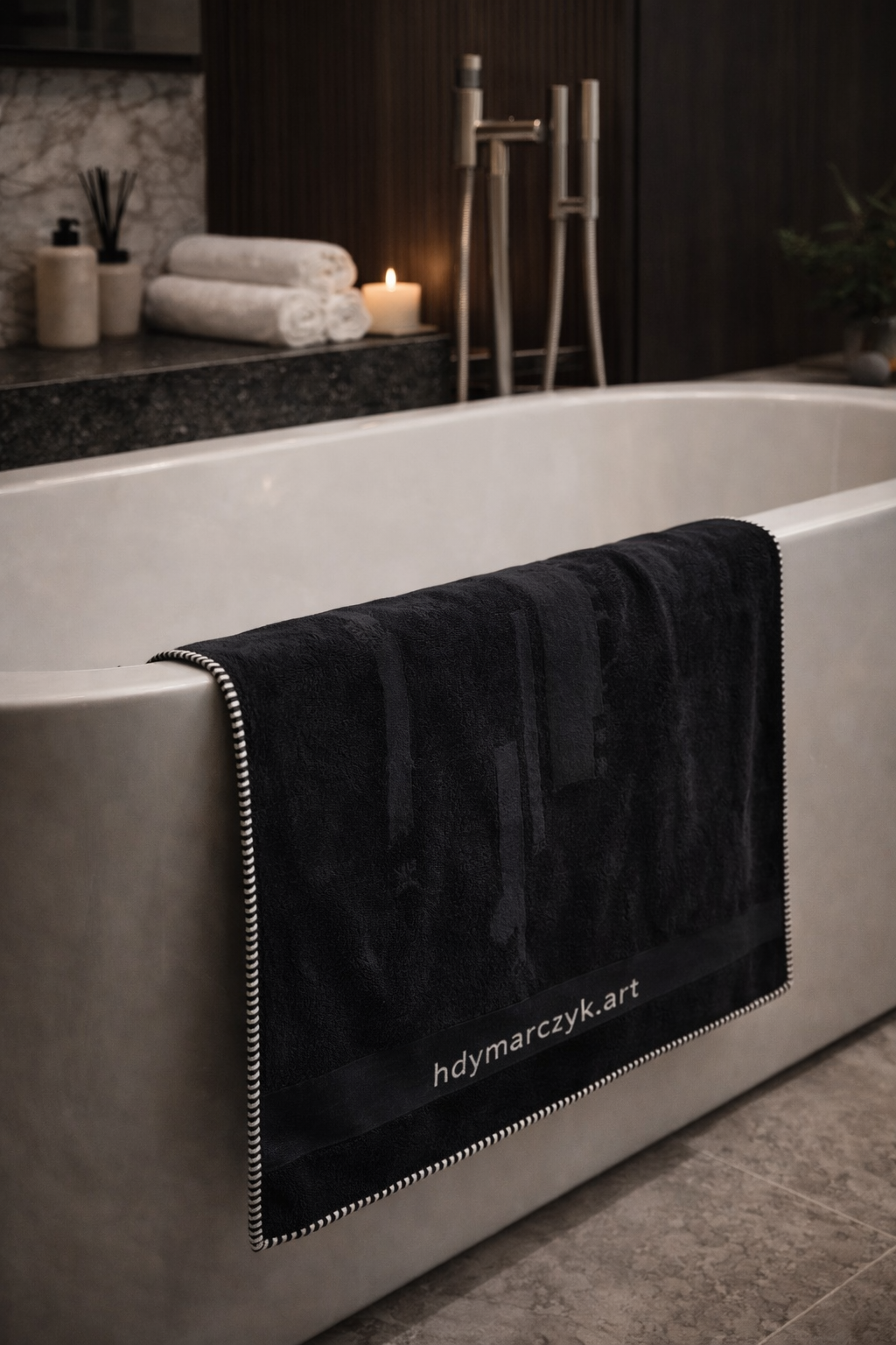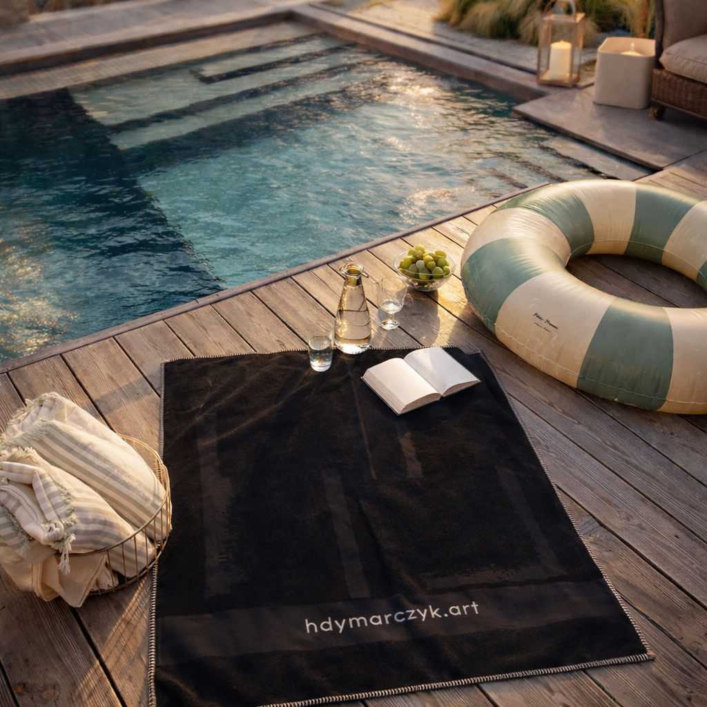 Model został wykończony białym overlockiem, który subtelnie podkreśla jego nowoczesny charakter. Relief laserowy wykonany na podstawie obrazu oraz haft nadają mu unikatowy wygląd. Doskonale dopełnia aranżacje minimalistyczne, elegancke i premium. Dzięki wymiarowi 100 x 150 cm doskonale sprawdzi się jako ręcznik kąpielowy, jak i plażowy.